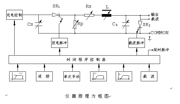 儀器內(nèi)部有一個(gè)直流穩(wěn)壓源提供給主回路充電電容Cs一個(gè)穩(wěn)定的充電電容,其值可以從0~400V連續(xù)調(diào)節(jié),放電時(shí)間是由時(shí)間控制器輸出給可控硅一個(gè)觸發(fā)信號(hào),這樣在放電回路里得到一個(gè)沖擊脈沖波形。脈沖的頻率是由時(shí)間控制器控制,當(dāng)外接充電電容Cs時(shí),其頻率在3Hz,需要單次手動(dòng)時(shí),由手動(dòng)開(kāi)關(guān)控制,接一下開(kāi)關(guān)輸出一個(gè)脈沖,使用內(nèi)接充電電容時(shí)脈沖頻率為250Hz,時(shí)間控制器頻率是由工頻電源的頻率分頻后產(chǎn)生的,所以頻率穩(wěn)定便于通用示波器測(cè)試。